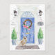 Announce your new address with our stylish announcement featuring a Ragdoll cat, blue front door, welcome mat, slate sign, topiaries and a floral wreath set on a gray brick background.