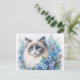 This floral Ragdoll postcard features a vibrant floral watercolor illustration of the long-haired, blue-eyed cat framed by a delicate wreath of soft blue and lavender forget-me-not flowers. The cat’s lifelike fur, expressive crystal-blue eyes, and the lush arrangement of blossoms create a gentle, heartwarming aesthetic that blends realism with floral fantasy.
