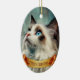 A close-up portrait of a Ragdoll kitten with striking blue eyes. The cat has a fluffy, white coat and is wearing a black collar with a blue gemstone charm. The cat's eyes are wide open and focused on something off-camera, creating a sense of curiosity and wonder. The background is a soft, pastel blue with delicate pink blossoms scattered throughout, adding a touch of whimsy and elegance to the image.
