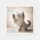 A fluffy ragdoll kitten with bright blue eyes plays with colorful bubbles lifting its paw in curiosity