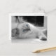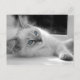 A postcard with a photo of a ragdoll kitten in black and white with a splash of colour on the eyes