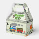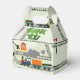 A cartoon style maze of train tracks with trains, signs and signals. "Thank You" text appears on the front and back of this train and track decorated box. Perfect for a train-themed birthday party! Your Little train lover guests will love taking home their goodies in this box!