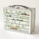 Metal lunch box featuring a cartoon style maze of train tracks with trains, signs and signals. Perfect for the little train-lover!