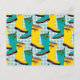 Colorful galoshes or rubber rain boots in bright yellow and turquoise are featured in this whimsical pattern set against tiled abstract umbrella shapes.