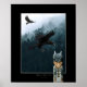 A dark Raven approaches an ancient Totem standing in the Great Bear Rainforest. Mists rise from the giant trees as a Bald Eagle passes overhead. A symbolic Totem Pole features the animals of the wilderness most revered by the native bands of the area. Animals like Eagle, Raven, Wolf and Bear depicted in a traditional hand-carved yellow cedar pole.