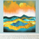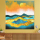 Abstract landscape scene of a mountain vista with rolling hills and a rain storm in orange, gold, blue, and cyan.