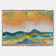 Abstract landscape scene of a mountain vista with rolling hills and a rain storm in orange, gold, blue, and cyan.