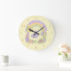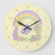 A colorful folkart design: on a pale yellow background sits a rainbow, the bottom edges are covered in pretty flowers, and two butterflies - one in yellow, one in blue - are flying above. The clock´s numbers are textured in rainbow colors, too.