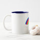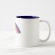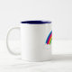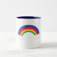 A colorful rainbow made up of blue, pink, purple, green, yellow and orange between two fluffy white clouds on a mug