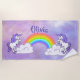 Rainbow and Unicorns Design Beach Towel with customizable personalization. For no text, delete sample name and leave blank.