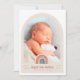 Share your new joy with this single photo birth announcement. This birth announcement features an arch shape framing your favorite newborn photo. A hand drawn rainbow in desert palette ties this modern design together.