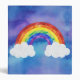 Watercolor style rainbow with white clouds and an indigo background