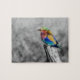 Beautiful rainbow-colored bird perched on a stump. The black and white background contrasts nicely with the colored feathers.