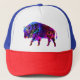 colorful artwork of a bison buffalo in all the colors of the rainbow on a trucker hat.
