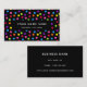 These business cards feature a confetti pattern of bright rainbow colored polka Dotson a black background. Personalize the text with your information.