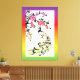 Rainbow, black peacock and cherry blossoms design featuring a rainbow and black silhouette of a peacock bird and a cherry branch -sakura tree- with lovely flowers in rainbow colors- purple, red, orange, yellow, green, blue on white background and a rainbow border. An elegant, floral template design with an oriental Japanese or Chinese Asian flair.