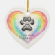A heartfelt pet memorial ornament featuring a hand-painted watercolor rainbow heart with a charcoal paw print and the quote, “In every lifetime, I’ll find you.”