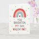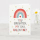 This cute rainbow greeting card features a simple rainbow arching across a white background. The rainbow has three bands in coral red, light pink, and robin’s egg blue, and each band is dotted with small white polka dots. Inside the blue band, there’s a small red heart that feels like the main point of the design. Scattered around the rainbow are little clusters of gold dots that look like confetti sprinkled across the card. Under the rainbow, the text reads “YOU BRIGHTEN, MY DAY, VALENTINE!” in neat sans-serif letters. “YOU,” “MY,” and “VALENTINE” are in coral red, while the rest of the words are in dark gray, and the message sits centered near the bottom. It’s a sweet, friendly card that works for a partner, friend, or anyone you want to cheer up ❤️💌🍫.
