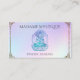 This custom business card features a Buddhist theme. An image of Buddha is printed across the center. A sample psychic medium name is printed above the Buddha. The back of the business card features the location and contact information. The background is a rainbow gradient, holographic design. An ornate gold frame borders the business card.