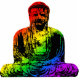 A stylized graphic of a buddha statue in rainbow colors.