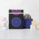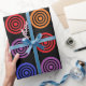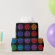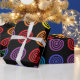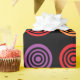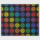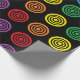 Rainbow colored polka dots with black circles inside them give the look of a bullseye design against a black background.