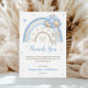 Send a heartfelt thank you with this adorable baby shower card! Featuring a soft watercolor rainbow in dreamy blue and beige tones, this charming design is paired with a sweet bunny floating with balloons. Gentle hearts and twinkling stars add a whimsical touch, making it perfect for expressing gratitude after a baby boy or gender-neutral celebration. A keepsake your guests will love!