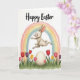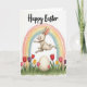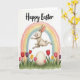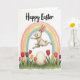 This card shows a cream-colored bunny 🐰 caught mid-leap above a large white egg near the lower center, as if it’s springing forward to greet someone special. Its round face, rosy cheeks, and softly blushed inner ears pair with an eager upward gaze that feels like a sweet, friendly invitation. A gentle rainbow arcs overhead in soft bands of red, orange, yellow, green, and blue, framing the bunny like a quiet embrace. Along the bottom edge, a strip of textured green grass holds tulips 🌷 in red, yellow, pink, and deep purple, adding a garden-fresh setting. The background stays bright white, letting the pastel colors and simple shapes stand out without distraction. Near the top, a seasonal greeting appears in flowing cursive-style lettering, centered and set in a dark tone for easy reading. The bunny’s tiny paws stretch forward above the egg, while the tulips cluster in a colorful row across the base.