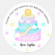 This rainbow cake thank you sticker features a hand drawn three tiered cake with a cute sun on top and rainbows on the front with icing and sprinkles. Customise the message to say what you would like to your guests. See the whole matching collection.