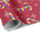 This Christmas wrapping paper has a rainbow candy canes design. There are two different swirled rainbow candy canes with snowflakes on red background. You can make the candy cane pattern bigger or smaller on this gift wrap. A fun Christmas gift wrap for your holiday season.