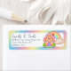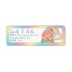 These custom address labels feature a cute and colorful candy land theme. An illustrated image of a candy gingerbread house is pictured on the right, with a little rainbow and cloud behind it. The background features a pastel colored, rainbow gradient pattern around the border. These labels make a sweet addition to your stationary.