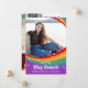 Rainbow themed graduation announcement printed with your graduate's photo inside a printed rainbow frame with white sparkles in a cartoonish style. Add their name in a retro script. On the back you can upload four more photos of the graduate, perhaps from different ages in their life, along with an about the graduate where you can share achievements or where they're planning to study next or what they're planning on doing next. A colorful graduation announcement card perfect for an LGBTQ graduate!