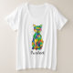 A painting of a rainbow cat. The cat is patterned like a tortoiseshell, only in a lot more colours. The text reads "Purrfect" but can be changed. Suitable for light clothing colours only.