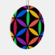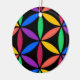 Abstract geometric design of interlacing circles, bright rainbow colors on black background