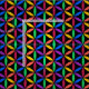Abstract geometric design of interlacing circles, bright rainbow colors on black background