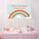 Rainbow themed birthday featuring an illustration of a rainbow peeking out from between white clouds over a blue sky.