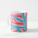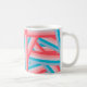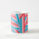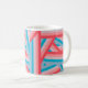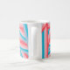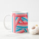 This mug has a striped design of groups of five stripes crisscrossing each other across the design blue, pink, peach, and coral. If you like the design but prefer different colors, message me.