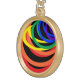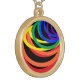 Here is a gorgeous necklace with an abstract three dimensional pattern of rainbow crescent moons in colors of red, orange, yellow, green, blue and purple on a black background.