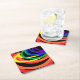 This set of colorful paper coasters features an abstract three dimensional pattern of rainbow crescent moons in colors of red, orange, yellow, green, blue and purple on a black background.