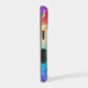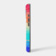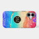 This elegant phone case features your two letter monogram in gold at the center of a black circle banner that is double framed in gold. The banner is placed on a vibrant rainbow color abstract background. Colors used include pink, orange, purple, aqua, tan, and blue, with tiny silver and gold faux glitter confetti.