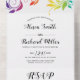 Rainbow colors colorful scroll leaf and gay and lesbian wedding invitation, featuring a colorful scroll leaf in rainbow colors on white background. The names are in script typography and the RSVP card can be detached.