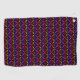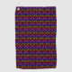 Colorful golf towel has rainbow ombre concho diamond style flower pattern on black background.