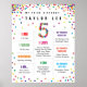 Celebrate the milestone's with your son or daughter's fifth birthday with this colorful rainbow confetti poster. Featuring your child's favorite books, foods, toys, height, weight, loves and more, you're sure to cherish this poster for years to come. Easy to edit and would look amazing framed for your party!