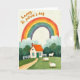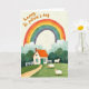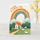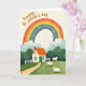 Designed with a wide rainbow 🌈 sweeping across the top of the scene, this St. Patrick’s Day illustration feels like a quiet walk to a cozy home. Below the arc, a small white cottage sits on a green hillside, topped with a terracotta-orange roof and finished with an emerald-green front door 💚. An ochre path curves toward the house, running alongside a white picket fence and layers of leafy green shrubs that make the setting feel tucked away and inviting. In the foreground, three fluffy sheep with rosy faces and legs graze close together, their gentle closeness reading like easy friendship as they share the same patch of grass. Yellow and white wildflowers dot the lawn around them, adding soft pops of color against the rich greens. The words “happy St. Patrick’s day” appear near the upper portion of the design, set beneath the rainbow in a dark green, hand-lettered style that stands out against the pale sky. The cottage windows are small and bright, the fence posts are evenly spaced, and the rainbow’s colors fade softly from red through violet above the hill.