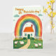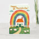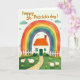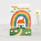 Designed with a cozy countryside scene, this St. Patrick’s Day card centers on a small cottage tucked under a wide rainbow 🌈. The house has an orange tiled roof and a deep green door, and a winding golden path leads toward it like an open invitation to walk in side by side. A white picket fence stretches on both sides, framing an emerald lawn where fluffy white sheep with rosy pink faces and legs graze close together, their gentle spacing suggesting an easy, friendly closeness 💚. Small yellow wildflowers dot the grass, adding bright little sparks around the sheep’s feet. Above, pale clouds drift across a light mint-green sky, and the rainbow arches overhead in a full sweep of color like a protective canopy ☘️. The greeting “happy St. Patrick’s day!” sits near the top in rounded lettering, set in a dark green tone that stands out against the sky. The fence posts, yellow flowers, and soft cloud edges are outlined with light, watercolor-like shading that keeps the whole scene airy and calm.