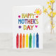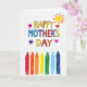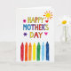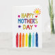 Designed with a childlike, colorful look, the card centers on large lettering that reads “HAPPY MOTHER’S DAY” in mixed bright shades, each letter outlined in black for a slightly uneven, drawn-by-hand feel. The words sit in the middle of the front, with the message stacked neatly so it’s easy to read at a glance. A sunny yellow circle with short orange rays glows in the upper right corner, as if watching over the greeting with gentle warmth ❤️. Small pink and purple flowers dot the space around the text, like little garden notes tucked into the margins. Two rounded hearts—one red and one pink—nestle near the lettering, adding a tender, affectionate touch without crowding the layout. Along the bottom edge, seven wax-like drawing sticks line up in a tidy row, shifting through a rainbow range from red to orange, green, and several blues 🌼. Each stick shows light texture marks, and the row forms a colorful base beneath the central message.