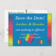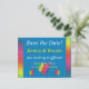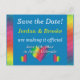 A simple yet elegant design that puts the important information front and center in an easy-to-read fashion. The solid background bordered by a splash of rainbow color makes this postcard hard to overlook in the mailbox! Chose any color you like for the background (shown here with a dusky blue on the front and white on the back). The back is pre-formatted for both the return and recipient address. If you prefer to hand-address your Save the Dates, simply leave the recipient address fields blank. Use the provided template fields to quickly personalize with your information. Click "customize further" to change font, size, colors, and positions.