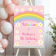 Welcome your party guests with an adorable personalized sign. The design features hand drawn daisies and a rainbow in pastel colors.
