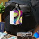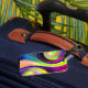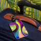 This luggage tag has an artsy design on it.
