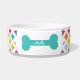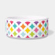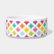 Brightly colored Rainbow Diamond Print dog bowl with blue bone frame for personalizing with your pet's name.