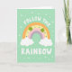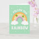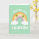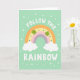 This card shows a softly arcing rainbow in pastel orange, lemon yellow, gentle pink, and light lavender, resting on two white clouds with faint shading against a mint green background. Small translucent white circles drift around like bubbles, giving the scene an airy, easygoing mood ☘️. The phrase “FOLLOW THE RAINBOW” appears in rounded white sans-serif letters, curving above and below the rainbow to mirror its shape. Two green shamrock shapes sit tucked into the yellow band, like a quiet little nod between close friends sharing a lucky day 💚. A few deep blue dots are sprinkled across the yellow and pink sections, adding contrast without taking attention away from the main arc. The clouds feel like a gentle landing spot, making the rainbow look like it’s floating in place. The mint background stays calm and soft, while the scattered circles keep the space from feeling empty. The rainbow’s pastel bands curve smoothly over the clouds, with the white text hugging the arch and the shamrocks nestled in the yellow stripe.